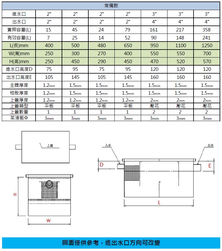 不銹鋼槽體焊接製作而成,耐高溫、不會生鏽、耐用壽命長。清潔方式:1.菜渣藍需要每天檢查,如有過多菜渣需清潔。2.槽身內浮油需每天撈除,避免孳生細菌。3.一個月大清槽身內部,去除淤泥,以免影響使用效果。<以上時間提供參考,如累積速度過快建議提前清潔。>備註